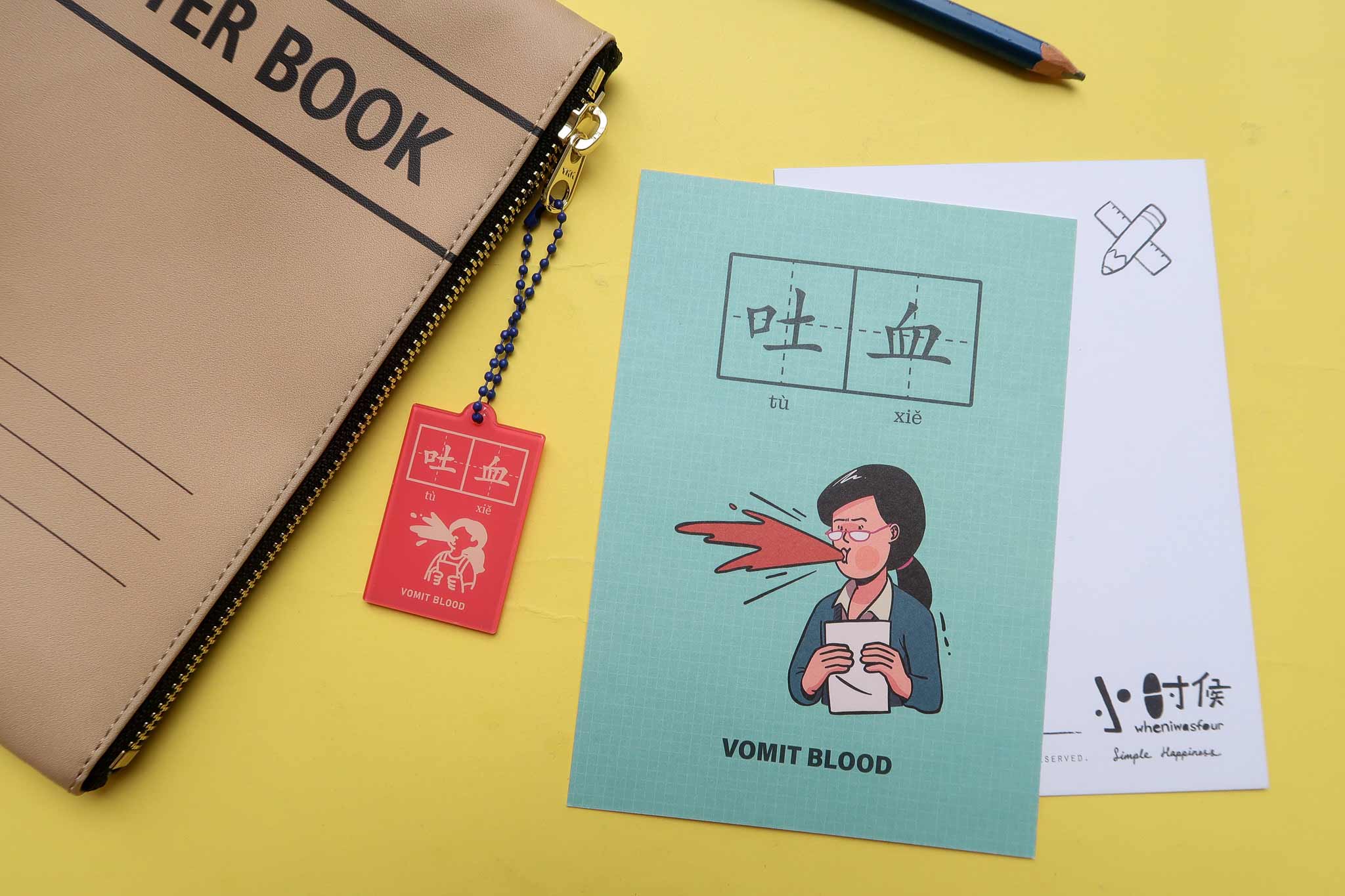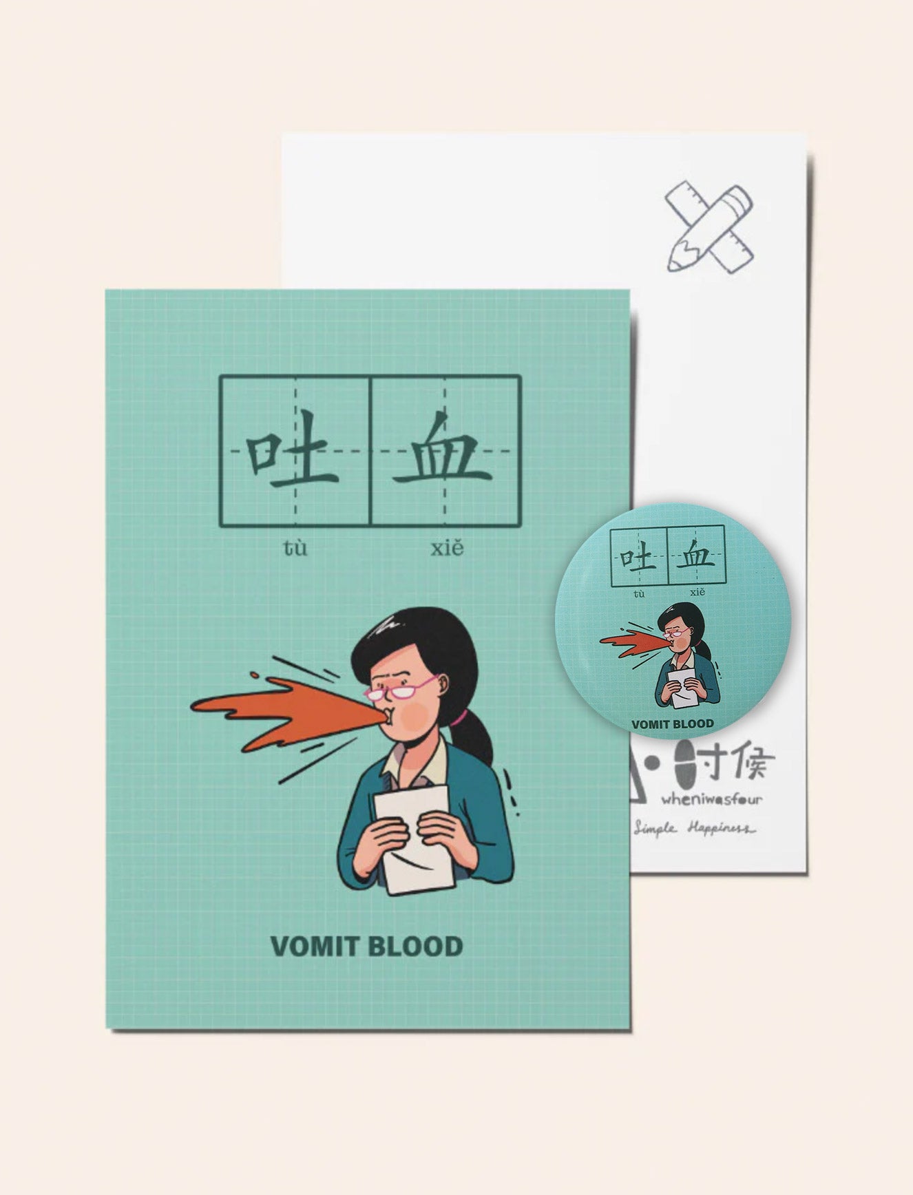 Celebrate Teacher’s Day with a hilarious twist! This card features the cheeky phrase “Vomit Blood / 吐血”, capturing that classic over-the-top student reaction we all know too well.