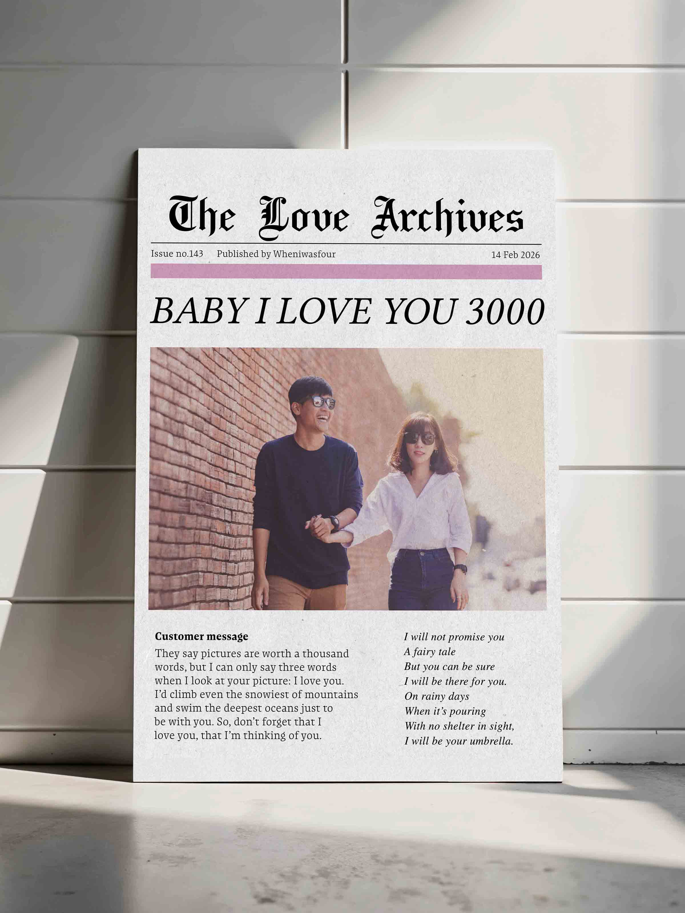 This personalised newspaper poster lets you feature a couple photo, newspaper main headline, customised issue date, issue number, and your own message written into the newspaper copy — creating a keepsake that feels timeless, thoughtful, and uniquely yours.