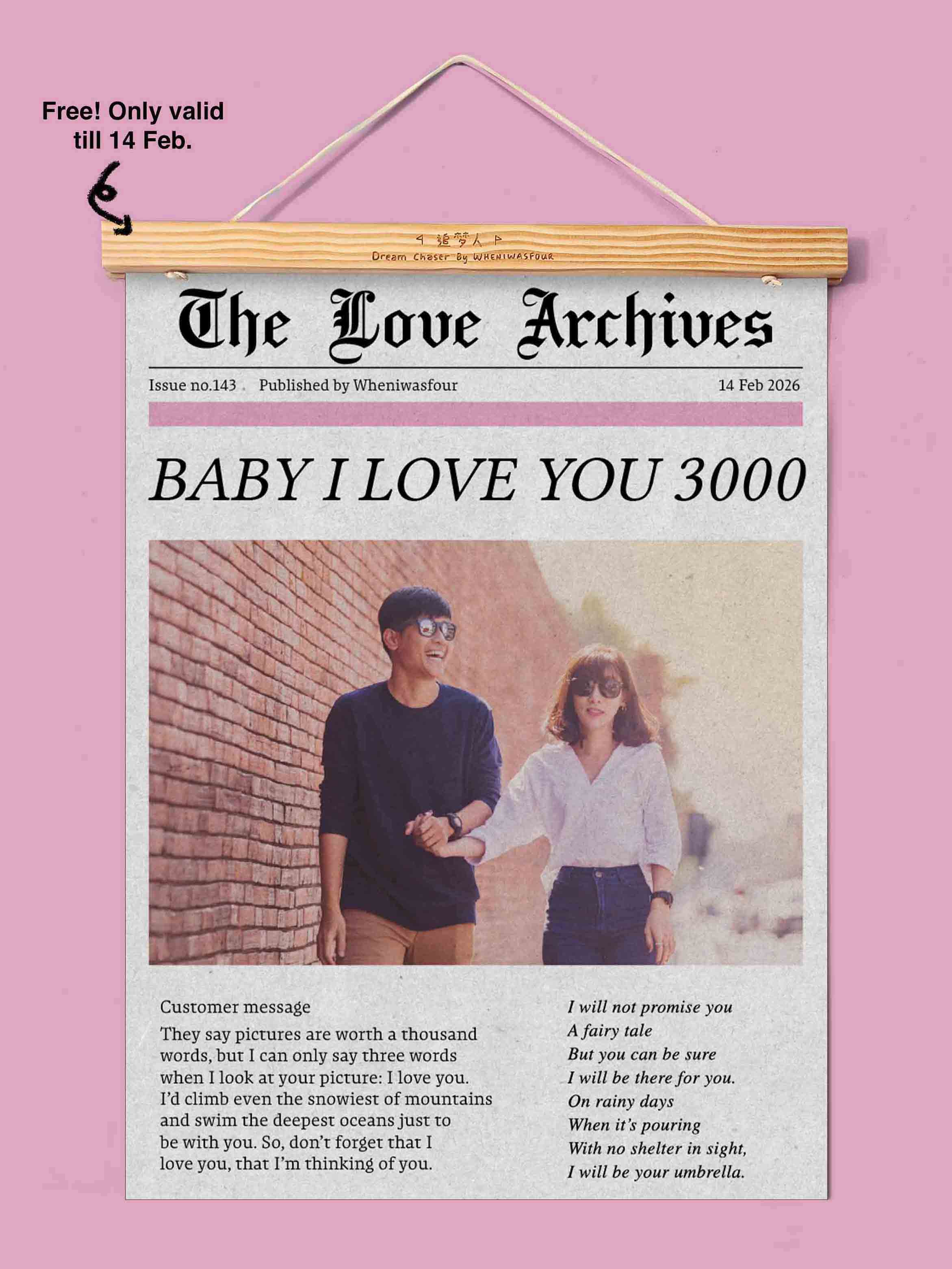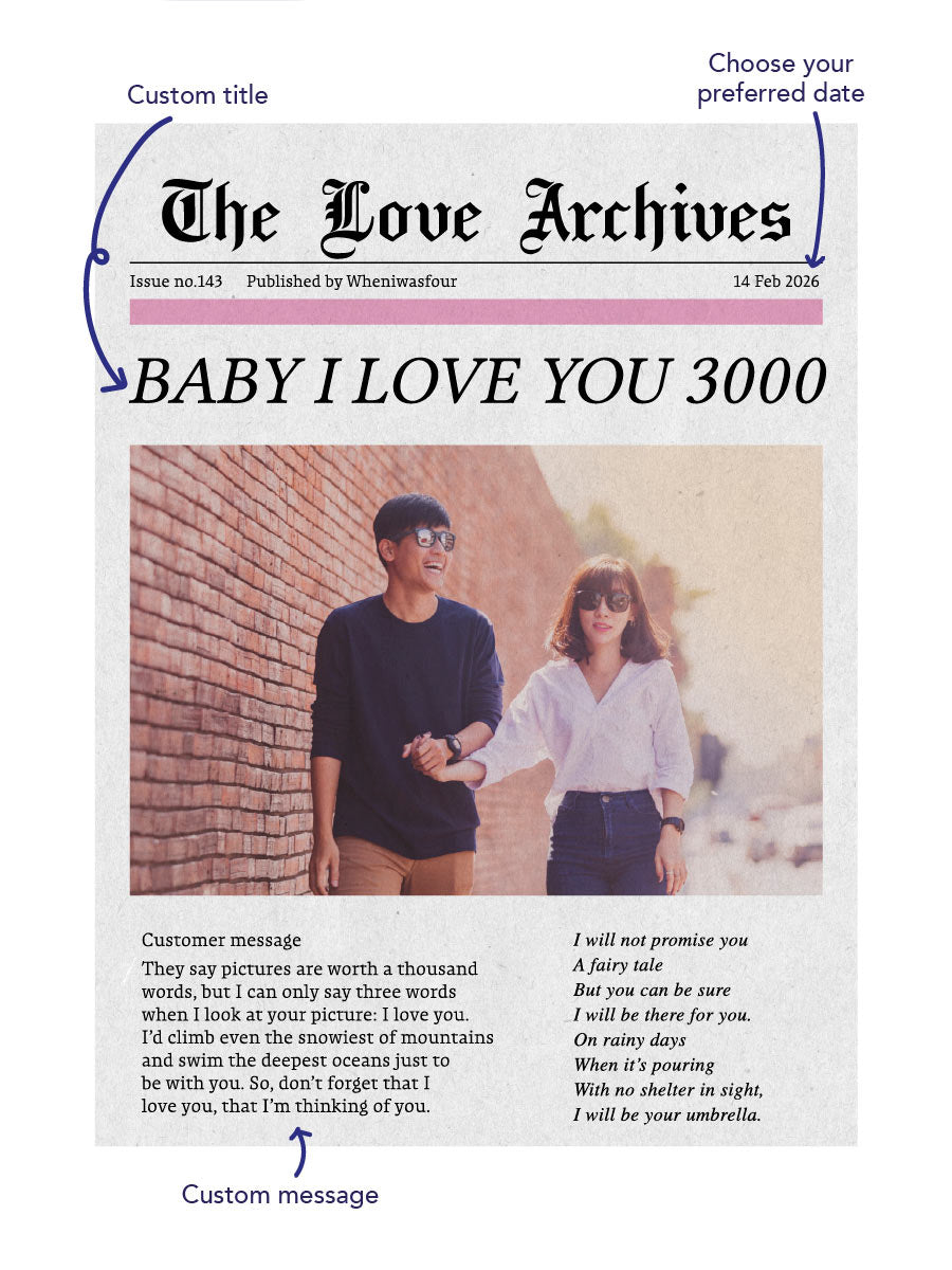 Designed in a classic newsprint style, The Love Archives Newspaper captures love in its quiet, everyday moments — the kind worth keeping, not shouting about.