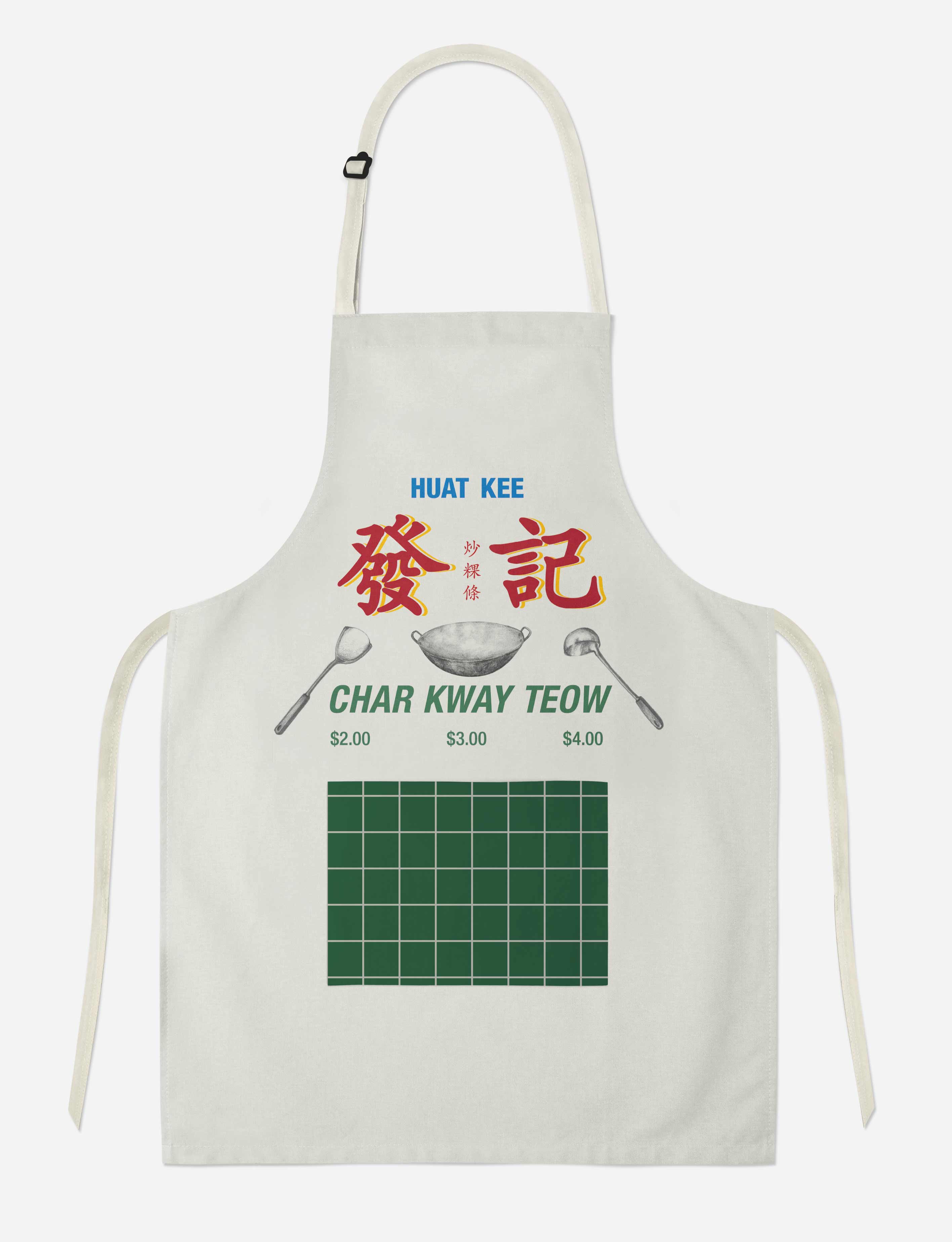 This bold and nostalgic apron brings the iconic char kway teow hawker signboard to life — complete with sizzling vibes and that unmistakable street food flair. Whether you’re cooking up a storm or just want to feel like a true hawker hero, this apron brings the heat (minus the grease).