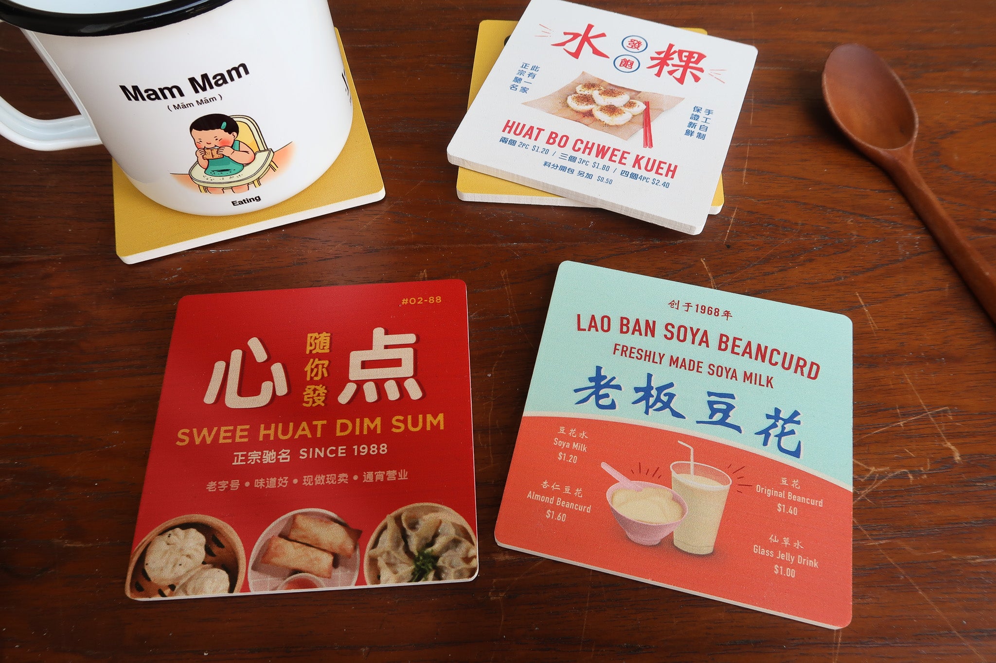 Bring a slice of local flavor into your home with these wooden coasters! Showcasing designs inspired by beloved hawker treats and iconic neighborhood shop signs, each coaster adds a cheerful burst of nostalgia to your space. Ideal for daily use or as a fun, thoughtful gift from Singapore.