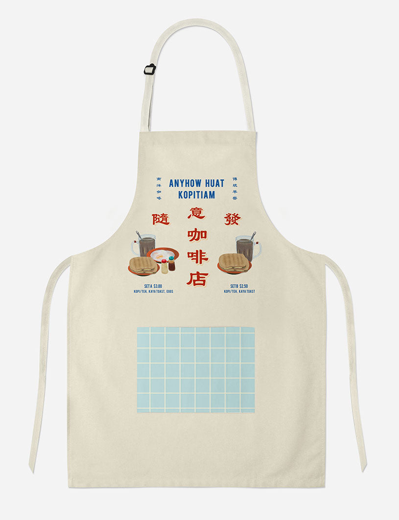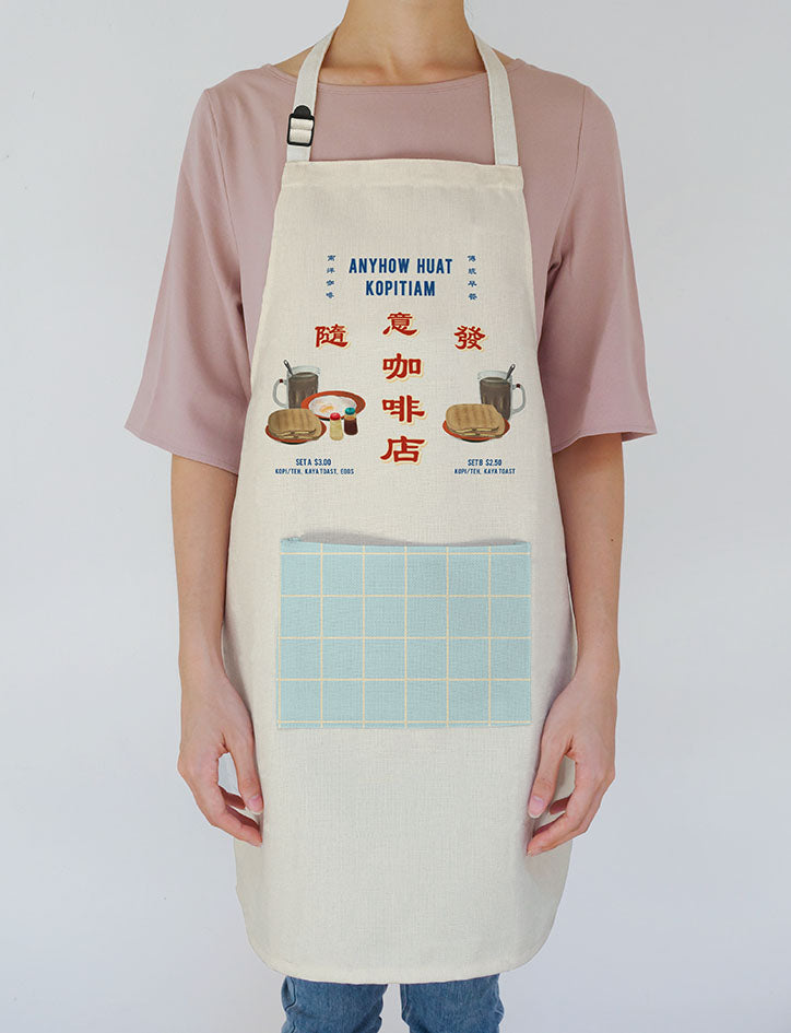 Now you can serve up tasty food in style with our new collection of aprons inspired by the hawker signages at Kopitiams.