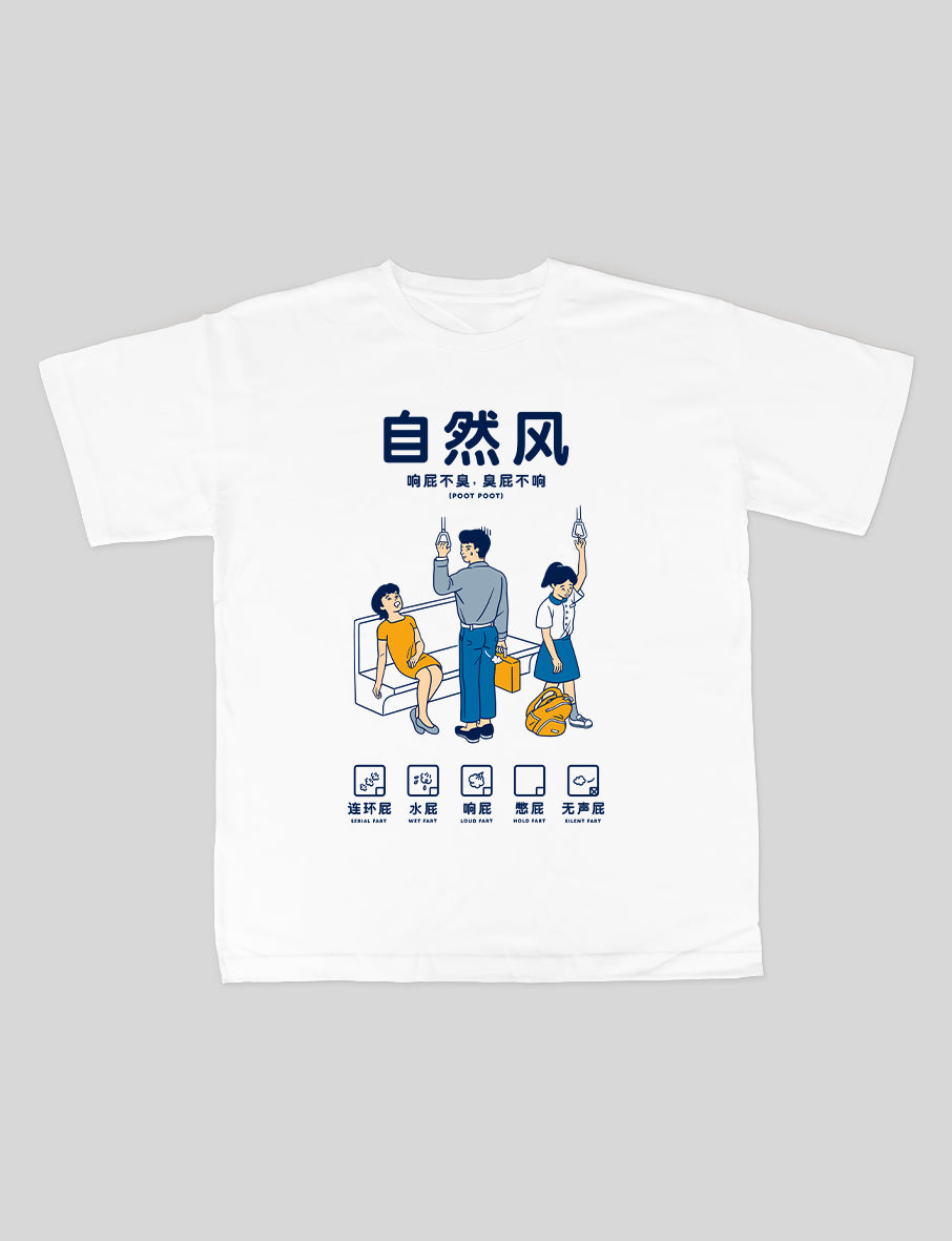 Our "自然风,Natural Wind" Poot Poot Series T-shirts! Add a whimsical touch to your wardrobe with humorous illustrations celebrating various types of flatulence. These shirts are suitable for any casual occasion. Our Poot Poot Series has a design to match your mood – from the silent-but-deadly to the rip-roaring and everything in between. These tees are quirky and versatile, sparking conversations and adding fun to your outfit. Get one today and let the wind of humor blow through your world!