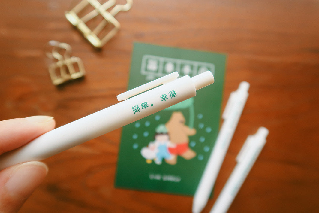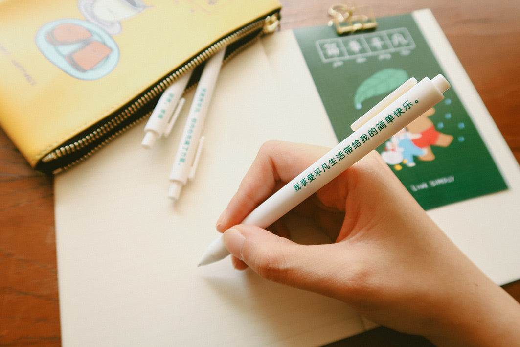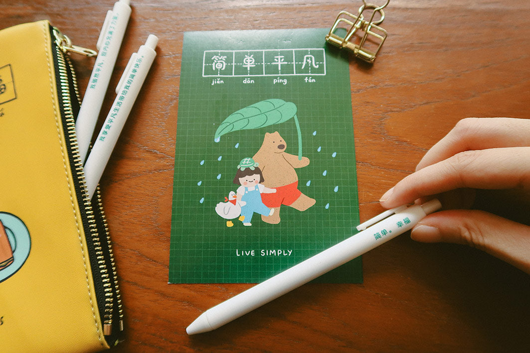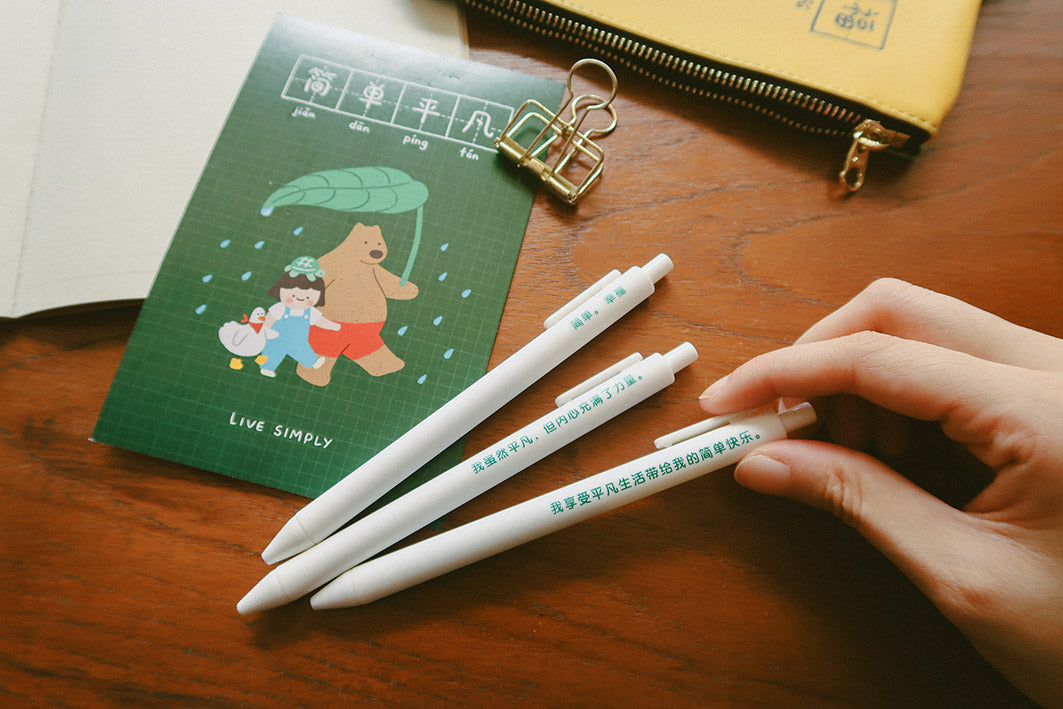 Embrace simplicity and cherish the everyday moments with our "Live simply, 简单平凡” ballpoint pen set. Each pen is adorned with a thoughtful quote to inspire mindfulness and gratitude in your daily life. Perfect for gifting to friends and family, this set also includes a postcard to spread positivity and joy to those around you.