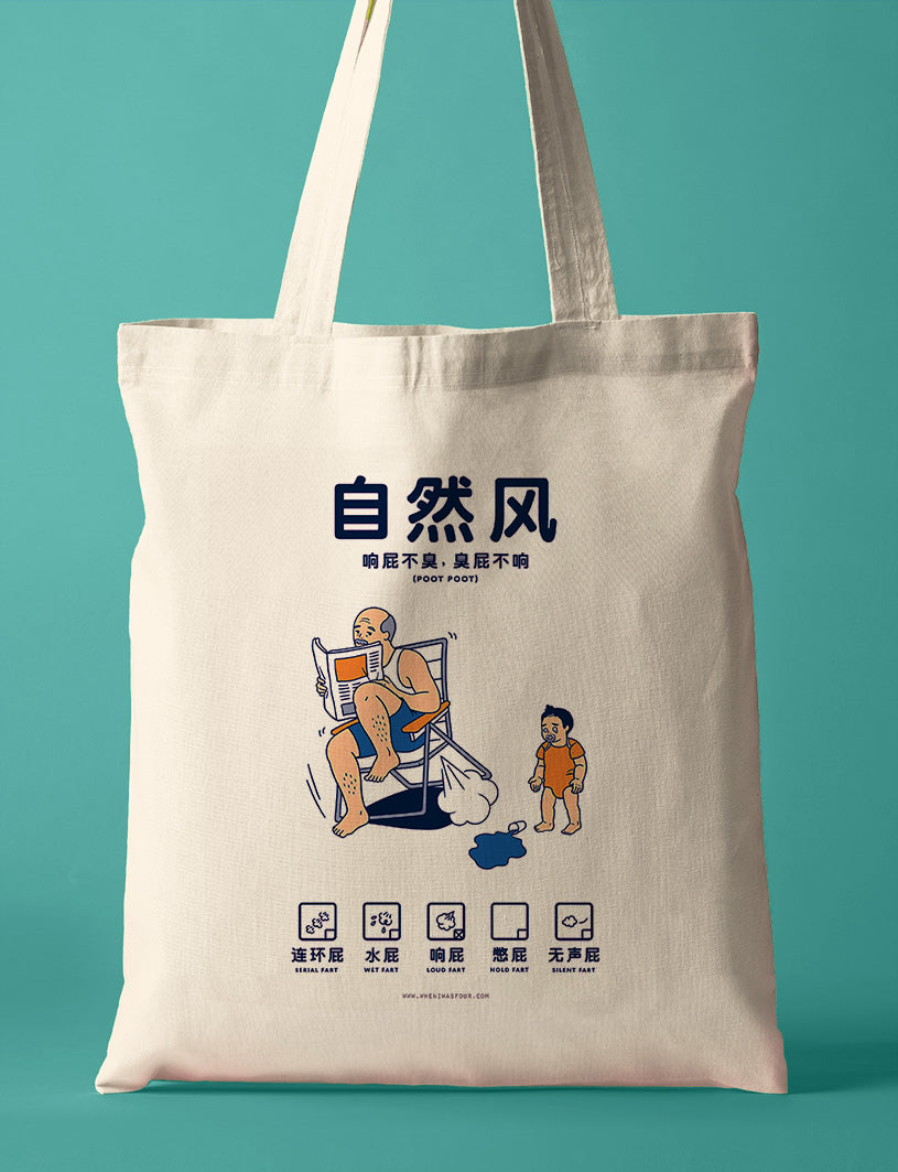 Introducing our "自然风,Natural Wind" Poot Poot Series tote bags! These bags add a whimsical touch to your daily essentials with humorous illustrations celebrating various types of flatulence. Perfect for any casual outing, our Poot Poot Series offers designs to match your mood – from the silent-but-deadly to the rip-roaring and everything in between. These totes are both quirky and versatile, sure to spark conversations and bring a playful element to your daily carry. Grab one today and let the wind of humor blow through your world!