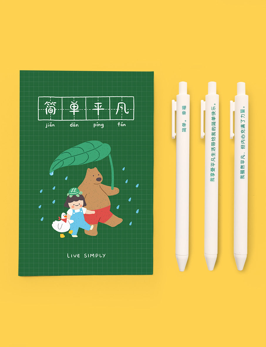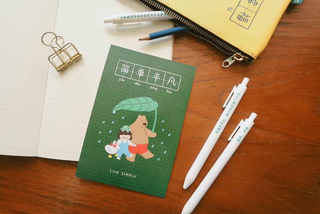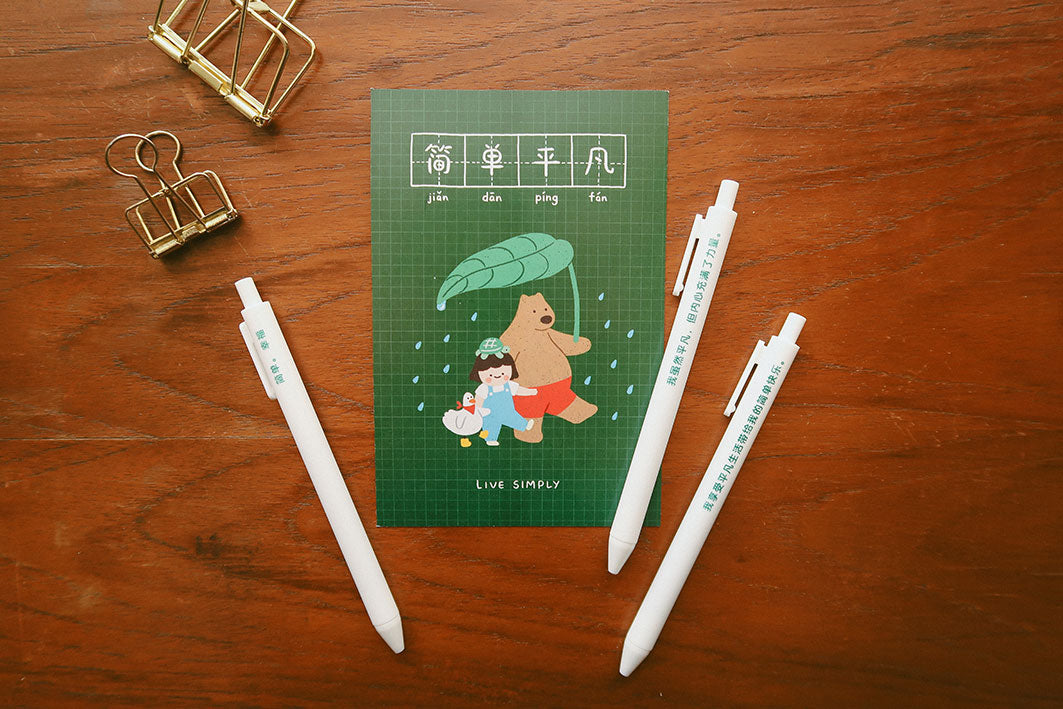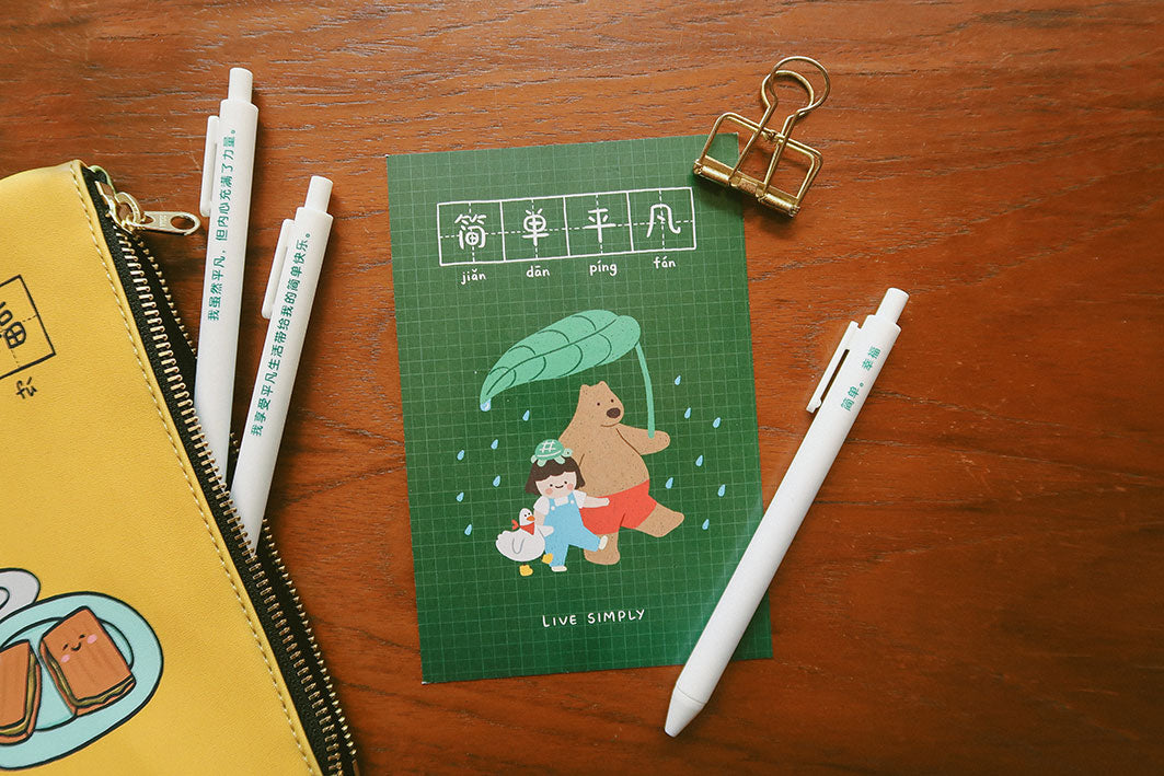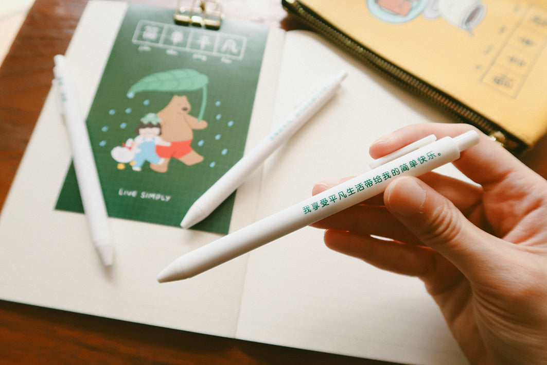 Embrace simplicity and cherish the everyday moments with our "Live simply, 简单平凡” ballpoint pen set. Each pen is adorned with a thoughtful quote to inspire mindfulness and gratitude in your daily life. Perfect for gifting to friends and family, this set also includes a postcard to spread positivity and joy to those around you.