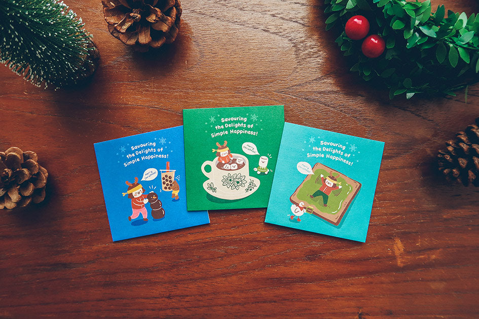 Introducing "Savouring Simple Happiness" Mini Christmas Cards, the perfect addition to your holiday gifts. Each pack contains three mini cards with a tagline that sums it all up - "Savouring the Delights of Simple Happiness." These cards feature charming illustrations of a dream chaser girl and friends enjoying local food like kaya toast and kopi, radiating warmth and the joy of togetherness. Make your gifts extra special this Christmas with these cards, spreading love and festive cheer with every heartfelt message.