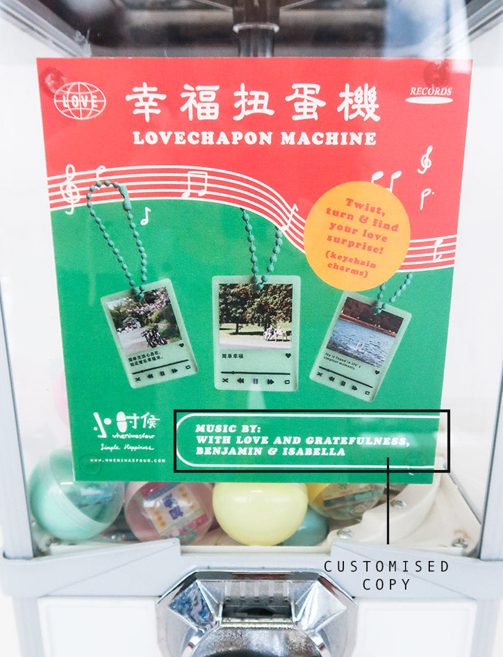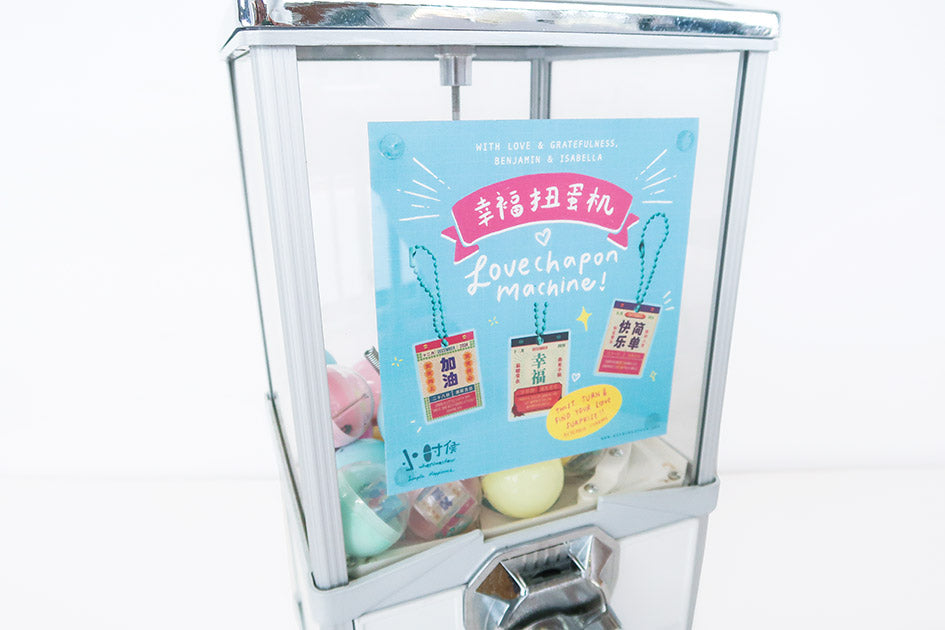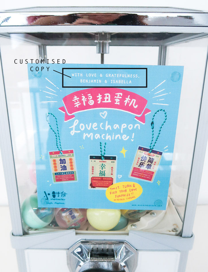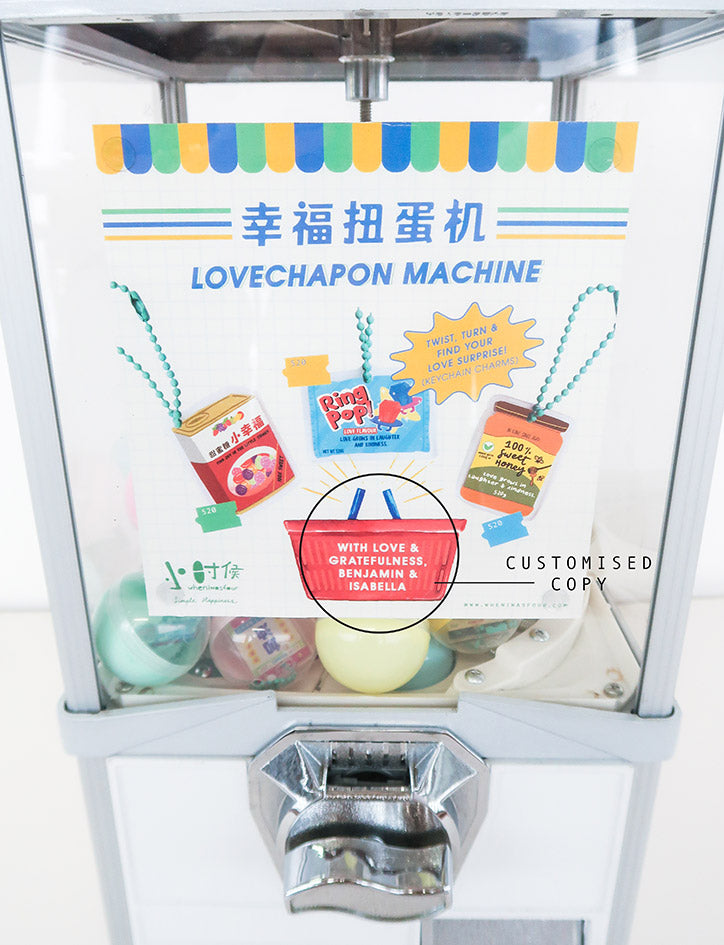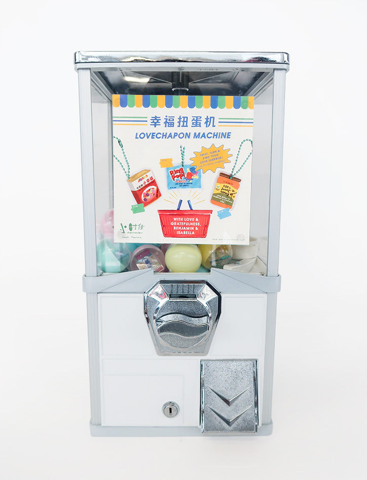 Bring a touch of nostalgia and fun to your wedding with our Lovechapon (gachapon) machine rental, available only with the purchase of our customized wedding keychain charms. Let your guests relive their childhood memories as they turn the machine for a special keepsake.