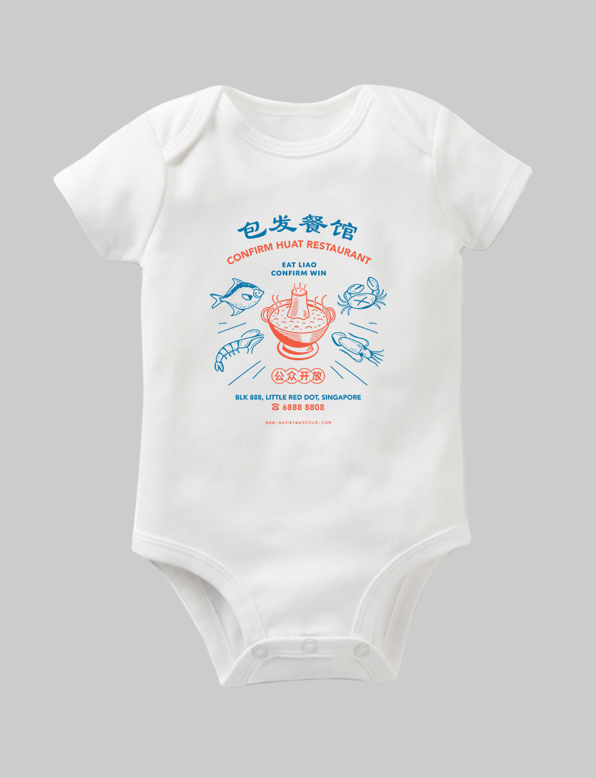 Serve up some serious cuteness with our Bao Huat Restaurant baby romper — inspired by the iconic old-school zi char takeaway boxes.